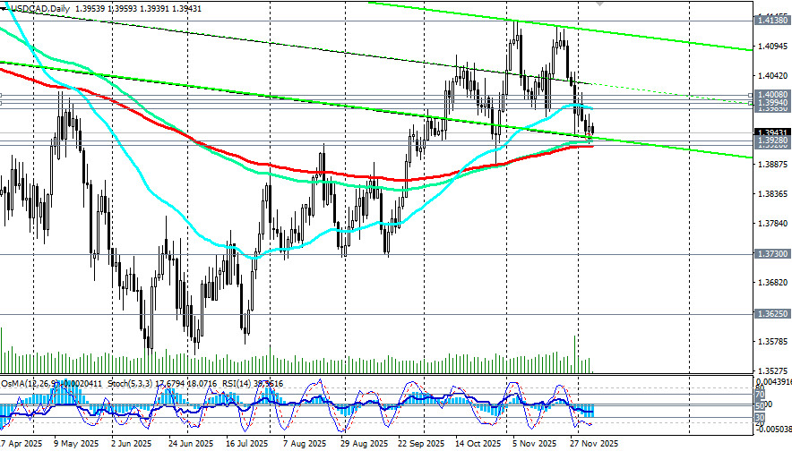 USD/CAD постепенно приближается к нижней границе диапазона, сформированного ранее между уровнями 1.3900 и 1.4000. Более широкий диапазон располагается между уровнями 1.3900 и 1.14100.