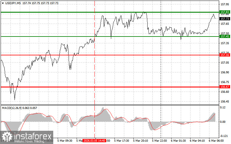 Сценарий №2: покупать USD/JPY сегодня также планирую в случае двух подряд тестов цены 157.40 в момент, когда индикатор MACD будет находиться в области перепроданности. Это ограничит нисходящий потенциал пары и приведет к обратному развороту рынка вверх. Можно ожидать рост к противоположным уровням 157.90 и 158.43.