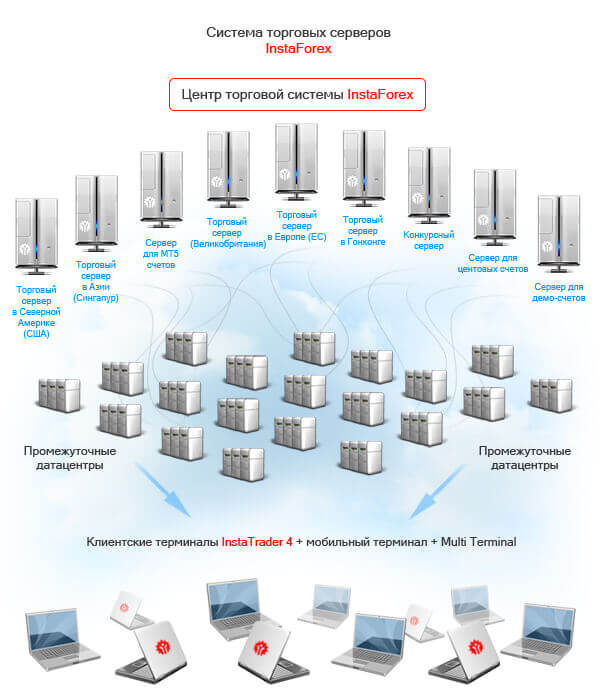 Бугунги кунда InstaForex компанияси Forex бозорида етакчи жаҳон брокерларидан бири ҳисобланади. Компания мижозлари сони бутун дунё бўйича 7 000 000 кишидан ортди. InstaForex савдо тизими доирасидаги операциялар ҳажми кун сари ортиб бормоқда. Шу муносабат билан InstaForex компанияси хизматлари савдо сервислари тизимнинг тўхтовсиз ва сифатли ишлашини таъминлашга катта эътибор беради, бу тизим эса катта миқдордаги серверлар, шу жумладан оралиқ дата марказилар ўртасида мижозлар битимларига буюртмалар оқимини тақсимлашни таъминлайди. Айни пайтда InstaForex савдо тизими ўз ичига тўққизта 9 та тўла қувватли савдо  серверларини олади.