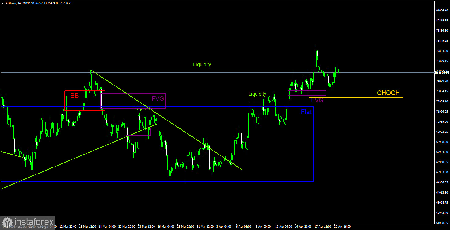 На 4-часовом таймфрейме цена продолжает формирование восходящей тенденции уже три недели. Характер движения криптовалюты остается максимально непривлекательным, но вполне обычным для коррекции. На 4-часовом ТФ до последнего не было ясно, остается ли биткоин внутри флэта, поэтому отработать можно было только последний сигнал от «бычьего» FVG, когда цена уже покинула боковой канал. Однако дальнейший рост находится под вопросом, так как на дневном ТФ цена приближается к «медвежьему» FVG. Преодоление линии CHOCH укажет на слом текущей восходящей тенденции, что может стать отправной точкой для нисходящей тенденции, которая в свою очередь может стать началом нового витка тренда на дневном ТФ.